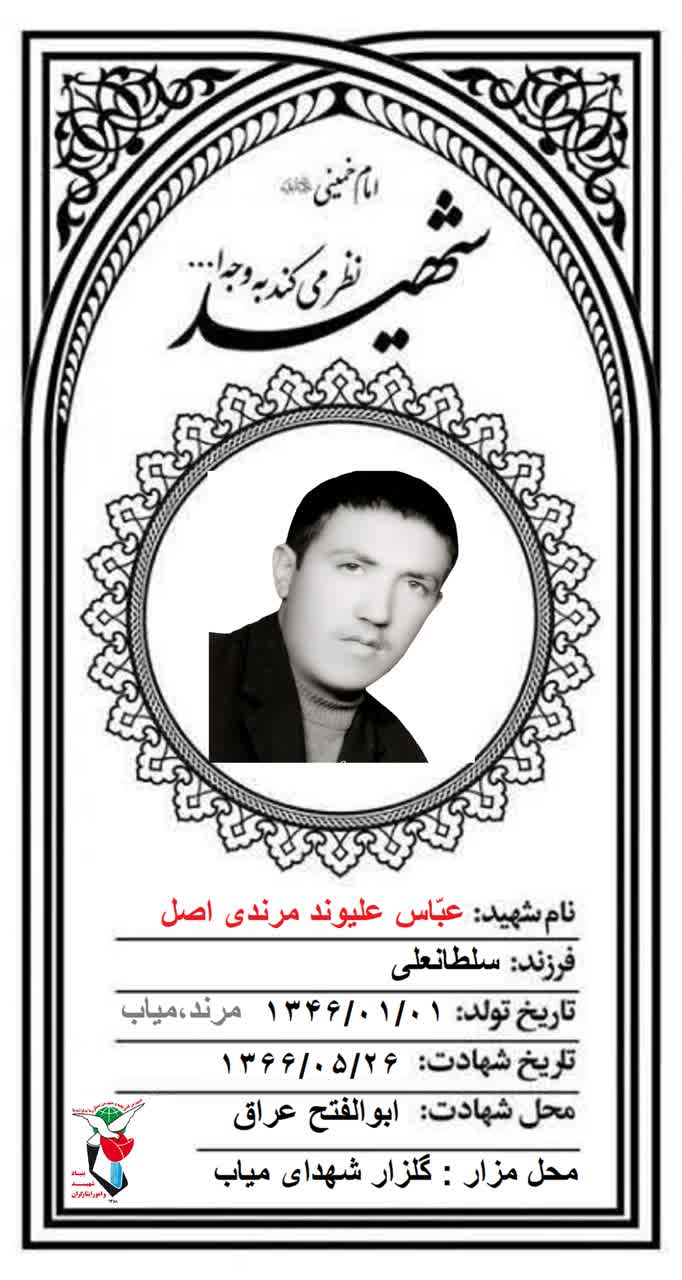شهید پاسدار وظیفه عبّاس علیوند مرند اصل فرزندسلطانعلی در اوّل فروردین ۱۳۴۶در روستای میاب از توابع شهرستان مرند استان آذربایجان شرقی در خانواده ای مذهبی به دنیا آمد پدرشهیدعباس مرندی در سالتحصیلی۵۵-۱۳۵۴ ایشان را جهت یادگیری علم ودانش در دبستان دولتی عنصری میاب ثبت نام میکند وبعدازمدتی پدرشان را ازدست میدهند ودوبرادر بنامهای علی وسیف اله ازایشان مراقبت میکنند وشهیدمرندی با آن سن کوچکش در تظاهرات علیه رژیم شاهنشاهی شرکت می کرد چنانچه معلمان مدرسه ایشان را از این کار ممانعت میکردند ولی شهید مرندی همچنان در تظاهرات شرکت می کرد بعداز پیروزی انقلاب اسلامی شهیدعباس علیوندمرندی در برنامه های انجمن اسلامی که از طرف بسیج سپاه مرند توسط شهید عسگریوسفی میاب اجرا می شد شرکت می کرد ودر جلسات قران وهیئت های حسینی شرکت می کردند چنانکه در ایام محرم به صورت تمام وقت فعالیت فعالیت می کرد شهیدمرندی پس از پایان دبستان بدلیل فقدان پدرومشکلات خانوادگی ورسیدگی به مادر مجبور به ترک تحصیل می کنند شهیدعباس مرندی در۱۸/۱۰/۱۳۶۵ به صورت پاسدار وظیفه به سربازی اعزام می شوند ودر سپاه پاسداران طی آموزش نظامی مشغول خدمت می شوند وبه جهه های جنگ اعزام می شوند ودر تاریخ۲۶/۵/۱۳۶۶ درمنطقه ی ابوالفتح عراق با اصابت ترکش به سر ودست وپا به شهادت میرسند وپیکرپاک شهید پس از آوردن به مرند توسط مردم شهیدپرور مرند ومیاب وروستاهای همجوارتشییع شد وپس ازاقامه نماز در قطعه ی شهدای میاب درجوارشهیدان بخاک سپرده شدوتنهاکسی که درفراق آن شهید تاحالاعزادارمانده بودمادرشهید،خواهرشهید ودوبرادرشهیدمیباشد واین درحالی است که مادرشهید ازدرد فراق فرزندش دارفانی راوداع گفت .یاد شهیدعباس مرندی ومادرش گرامی باد.