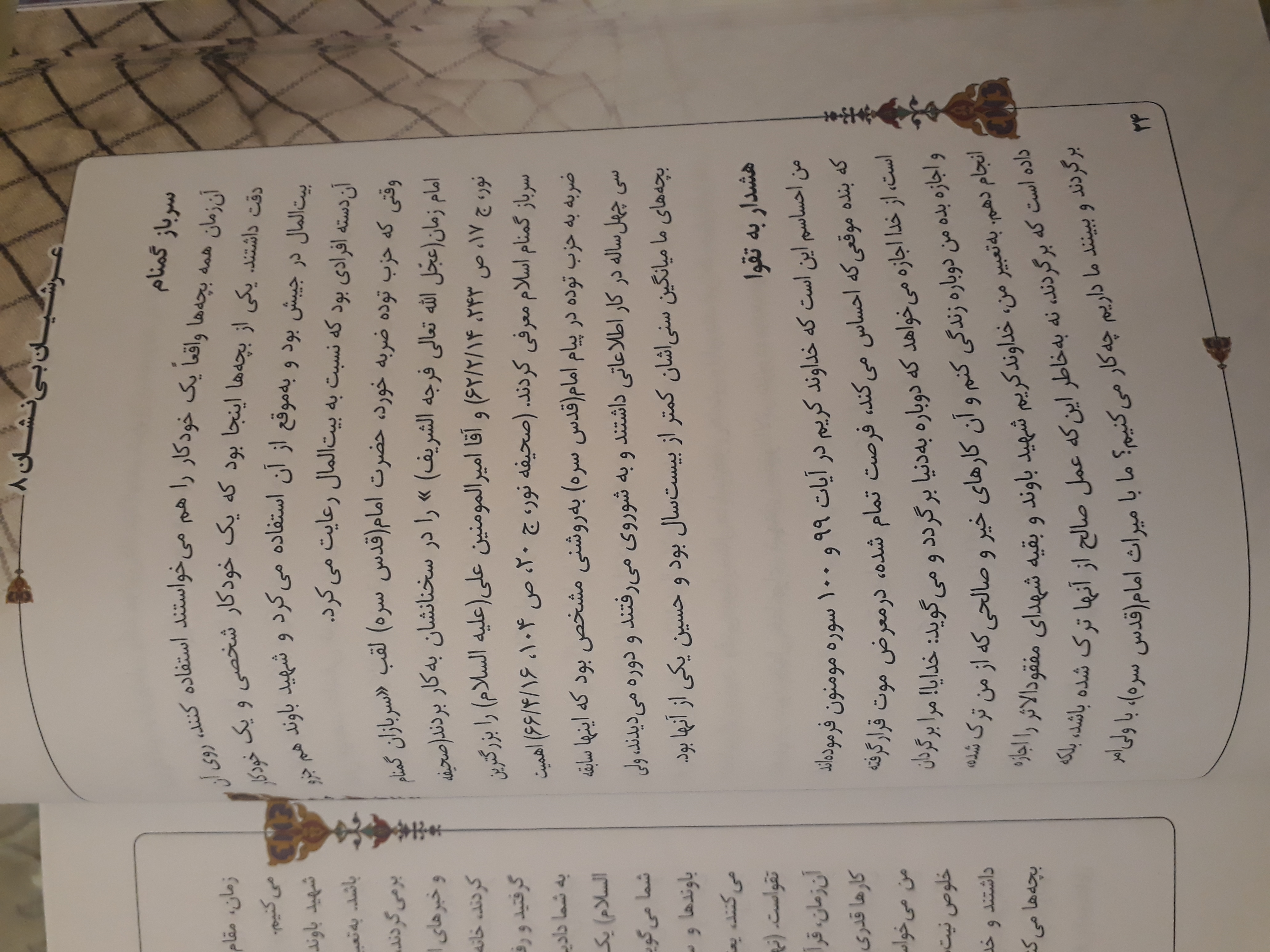 است که فرمودند: "عالم محضر خدا است، در محضر خدا معصیت نکنید." (صحیفه نور، ج ۱۳، ص ۲۳۸) ایشان خودش را همیشه در محضر خداوند کریم میدید و حرفی نمیزد، بلکه عمل می کرد. در رفتار واعمال، واقعا یک شیعه و مسلمان واقعی بود. و شعری هست که می گوید