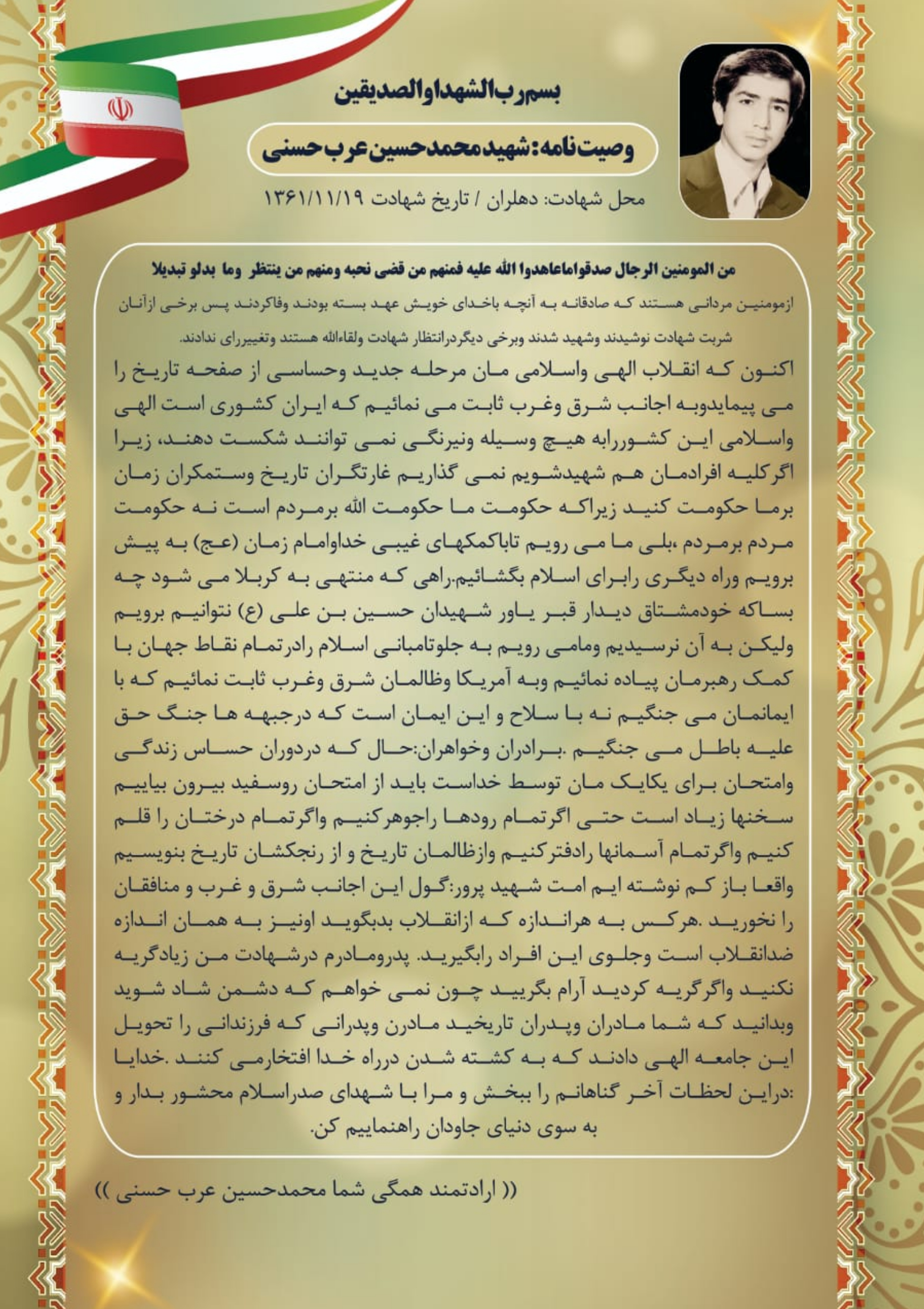 شهید محمد عرب حسنی در 1 فروردین ماه سال 1344 در تهران به دنیا آمد.این شهید والامقام دارای ملیت ایران و مذهب اسلام شیعه بود.وی تحصیلات خود را تا مقطع دوم راهنمایی ادامه داد و به عضویت بسیج درآمد. این شهید گرانقدر سرانجام در 19 بهمن ماه سال 1361 در سن 17 سـالگی و در عملیات سال والفجرمقدماتی حوادث ناشی از درگیری در پاسگاه رشیدیه به شهادت رسید. مزار این شهید در قطعه 28 ردیف 17 شماره 6
