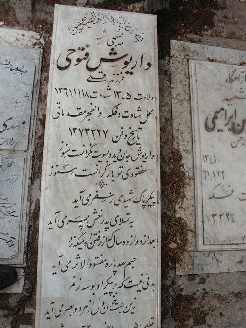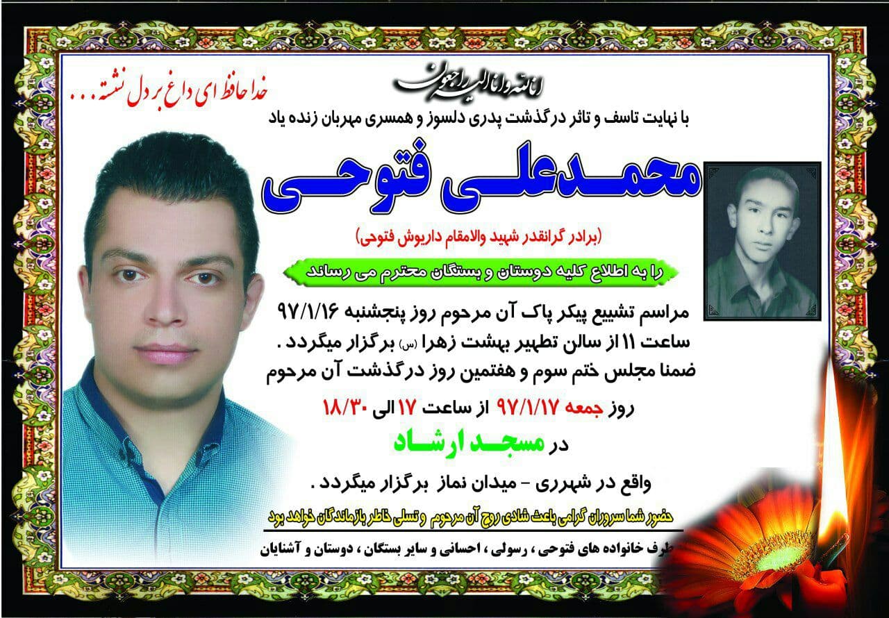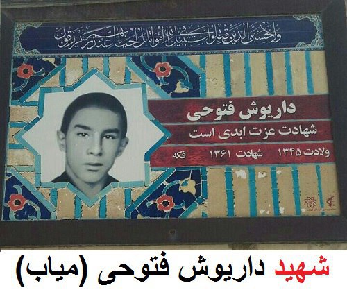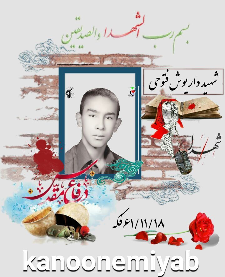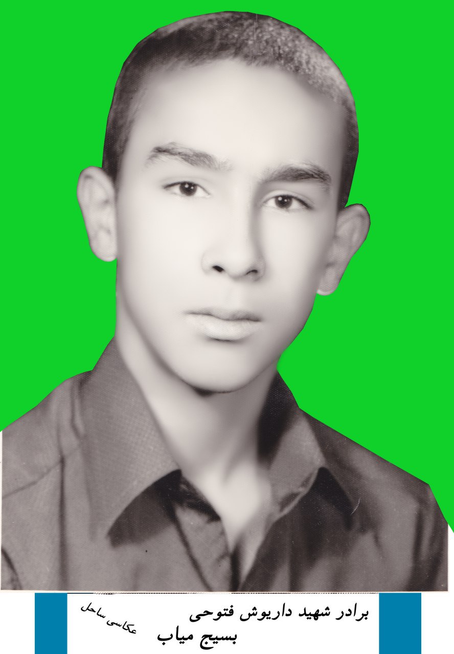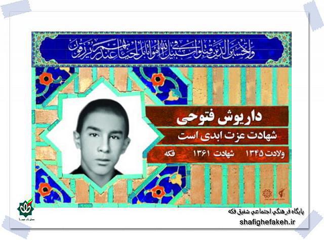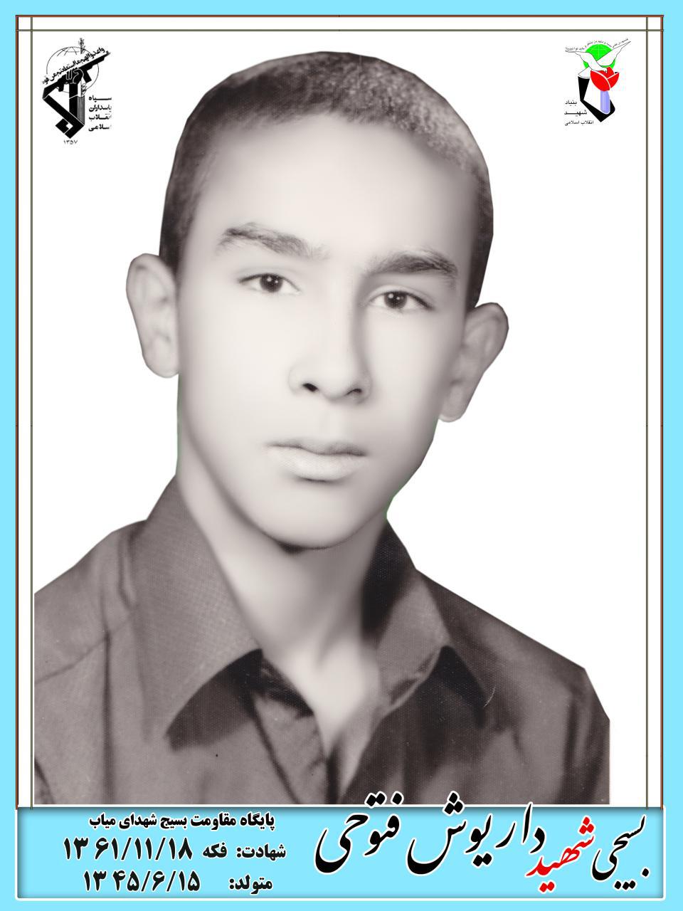 شهید داریوش فتوحی در 15 شهریور ماه سال 1345 در تهران دیده به جهان گشود.این شهید والامقام دارای ملیت ایران و مذهب اسلام شیعه بود.وی تحصیلات خود را تا مقطع سوم متوسطه ادامه داد و به عضویت بسیج درآمد. این شهید گرانقدر سرانجام در 18 بهمن ماه سال 1361 در سن 16 سـالگی و در عملیات سال والفجرمقدماتی حوادث ناشی از درگیری در فکه دعوت حق را لبیک گفت. مزار این شهید در قطعه 50 ردیف 33 شماره 6