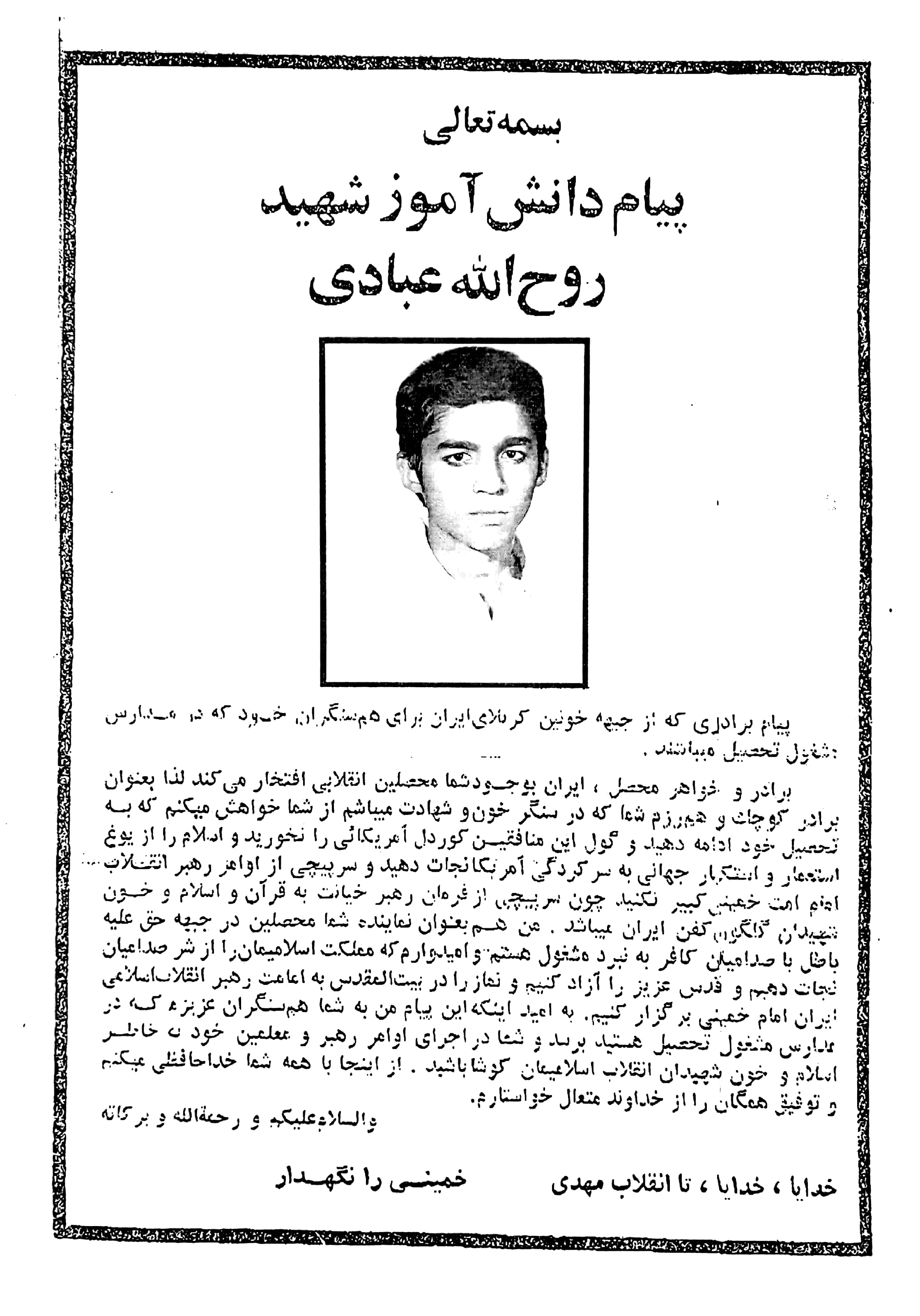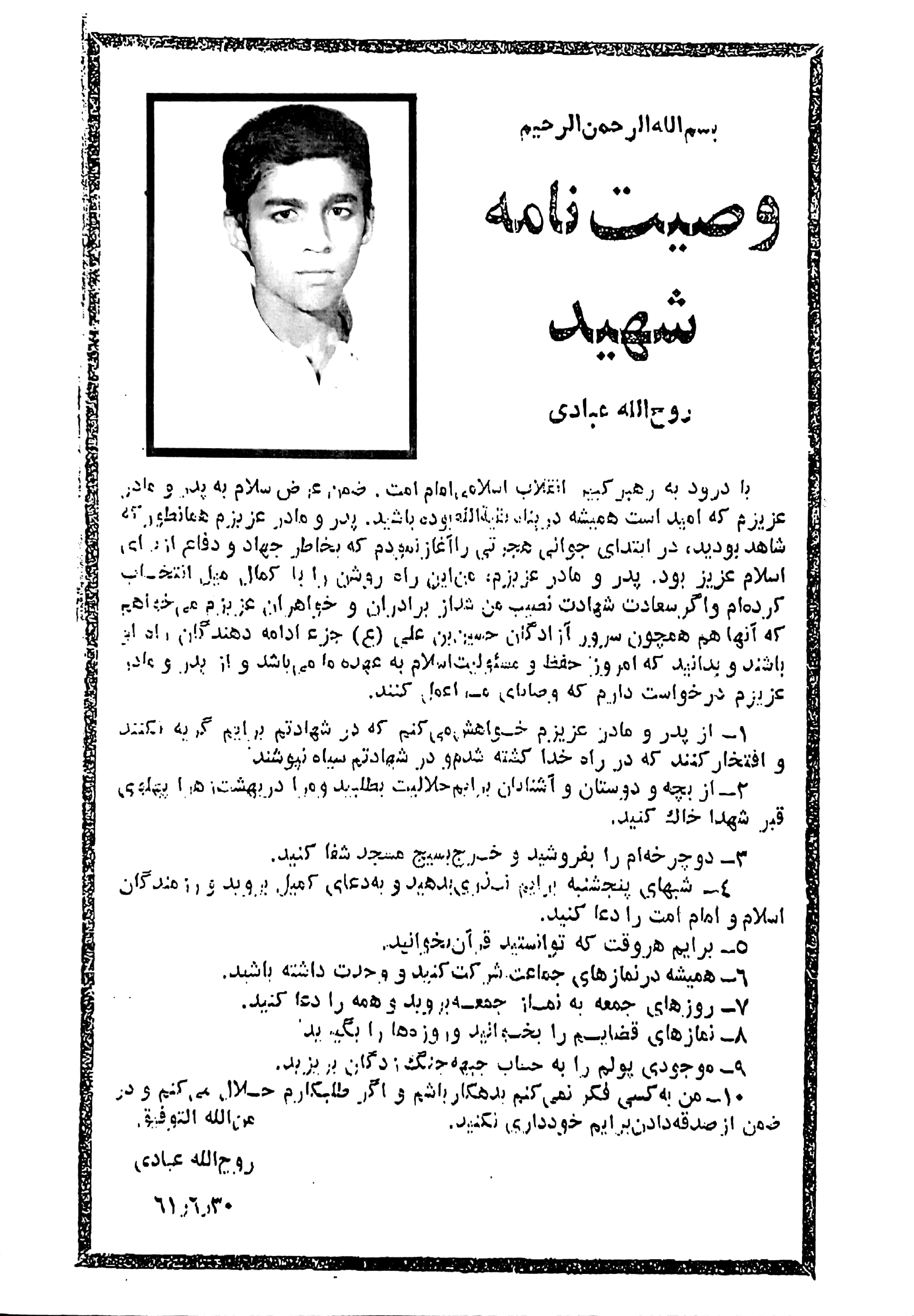 شهید روح اله عبادی کجانی در 1 مهر ماه سال 1344 در تهران به دنیا آمد.این شهید والامقام دارای ملیت ایران و مذهب اسلام شیعه بود.وی تحصیلات خود را تا مقطع پنجم ابتدایی ادامه داد و به عضویت بسیج درآمد. این شهید گرانقدر سرانجام در 13 مهر ماه سال 1361 در سن 17 سـالگی حوادث ناشی از درگیری در سومار به شهادت رسید. مزار این شهید در قطعه 26 ردیف 93 شماره 15