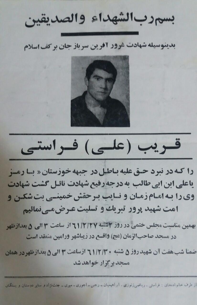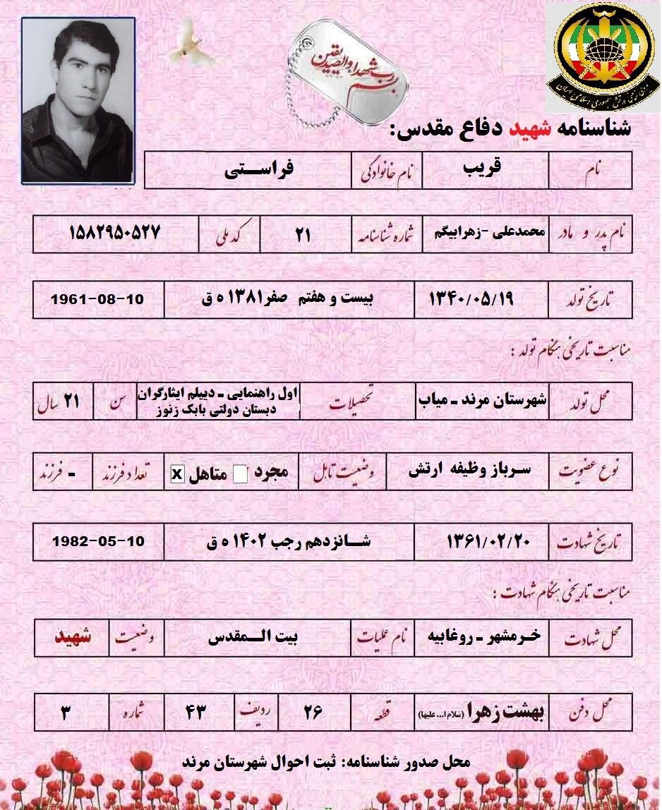 مشخصات شناسنامه شهید قریب فراستی شهید قریب فراستی