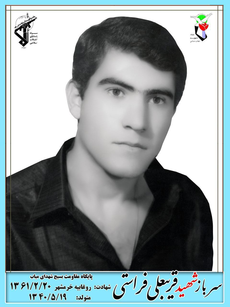 قريب علي فراستي در سال ۱۳۴۰ در خانواده اي معتقد و اهل تقوا در روستاي مياب شهرستان مرند ديده به جهان گشود و از همان ابتداي زندگي با قشر محروم جامعه آشنا و همراه شد. قريب علي دوره ابتدايي را در زادگاه مادرش زنوز دبستان منتظرقائم زنوز به پايان رساند بعد از دوره ابتدايي همراه خانواده راهي تهران شد و از سال ۱۳۵۱ به بعد در رشته ورزشي فوتبال دروازه بان حرفه اي در منطقه قرچك – ورامين به شمار مي رفت . در سال ۱۳۵۹ با دختر داييش ازدواج كرد و پس از آن به خدمت سربازي رفت پس از دوره آموزشي در خط مقدم جبهه روغابيه، خرمشهر و … با شجاعت با دشمن جنگيد و زمانيكه فقط از خدمتش پنج ماه مانده بود …. اين جهادگر بزرگ سرانجام در تاريخ ۱۳۶۱/۲/۱۵ در عمليات بيت المقدس در حين آزادسازي خرمشهر به مقام رفيع شهادت نايل شد و در ۲۰ ارديبهشت ماه ۱۳۶۱ در بهشت زهرا در كنار همرزمانش آرميد. هوشمندي ، بصيرت ، شجاعت و قاطعيت از ويژگي هاي بارز اين شهيد والا مقام شهيد قريب علي فراستي بود .